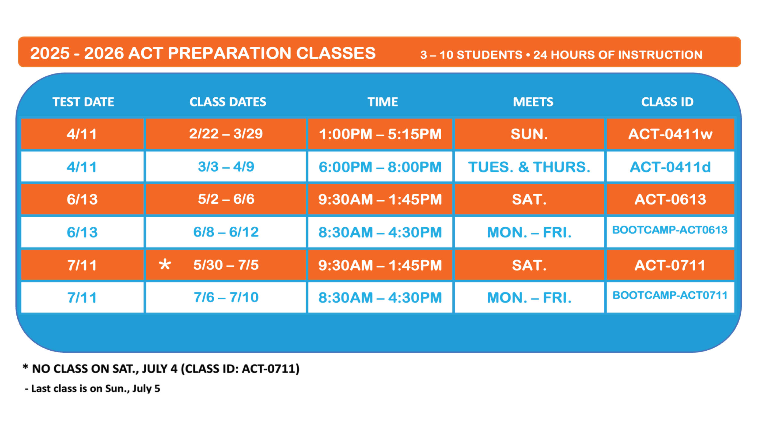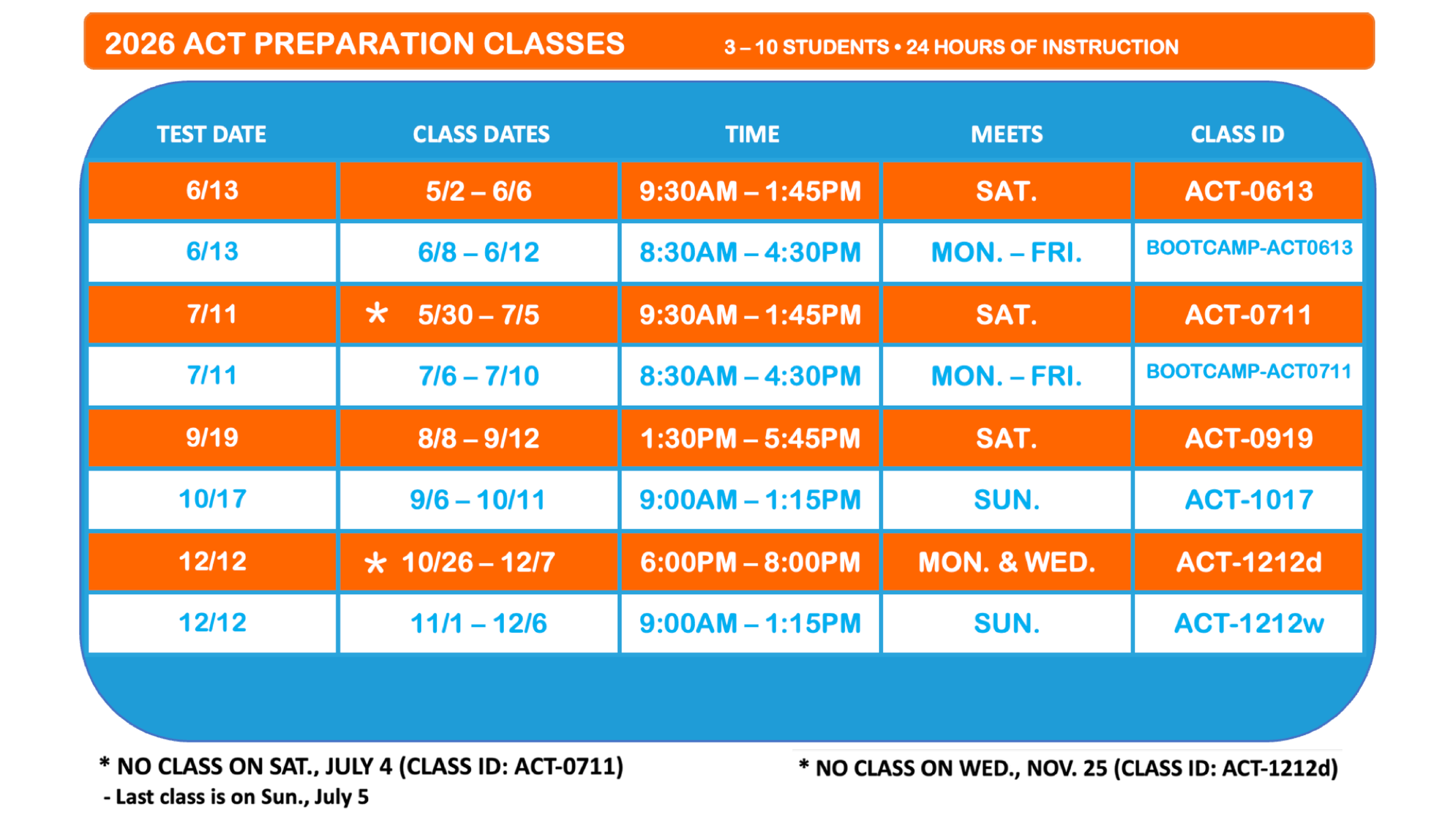 Click here to see our testing calendar - where you will see the ACT test dates for the current academic year. Call us at least 12 to 15 weeks ahead of a test date to get a diagnosis of what is needed for your particular case and to ensure eligibility for one of our classes.