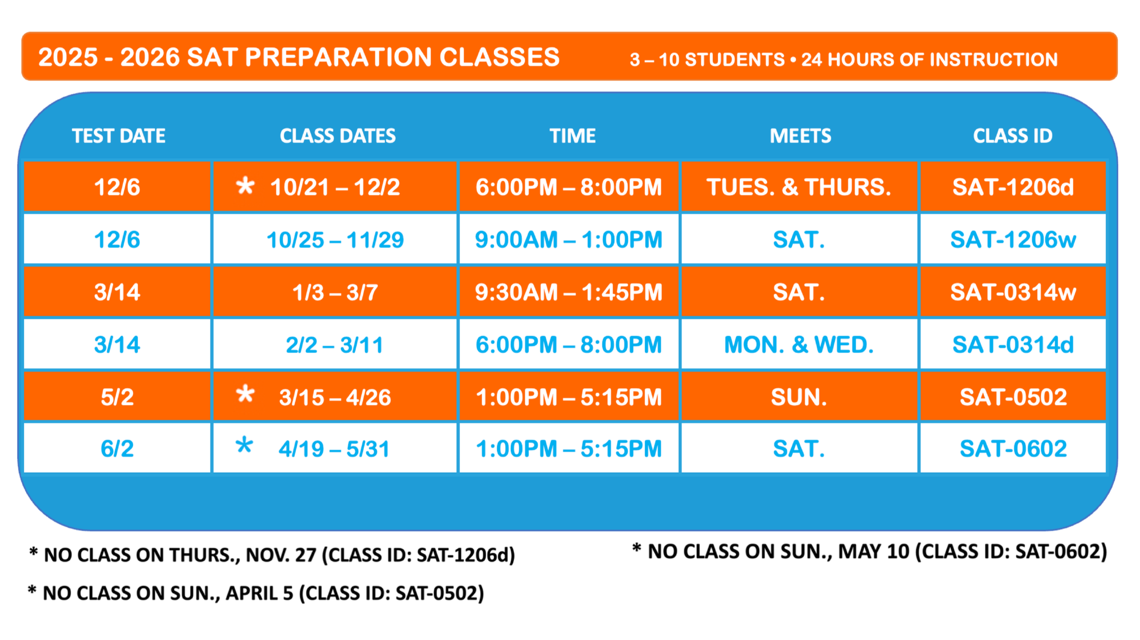 The best rule of thumb with the SAT is: “the earlier and more often, the better.” To see test dates for the current academic year, click here.